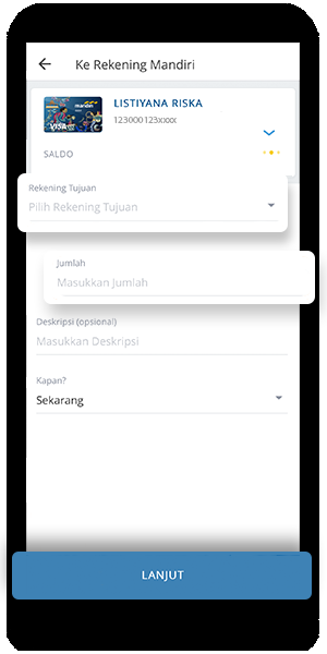 Cara Transfer Antar Bank di Livin' by Mandiri Cara Transfer Sesama. 1. Pilih Transfer ke Tujuan Baru. 2. Masukan Nama Tujuan Bank Mandiri dan No Rekening kemudian tap Lanjutkan. 3. Pastikan Nama dan Rekening Penerima sudah Sesuai kemudian tap Lanjut. 4. Masukkan Nominal Transfer kemudain tap Lanjut.