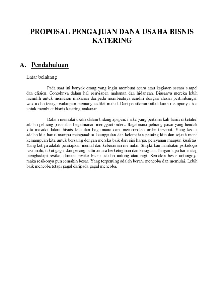 Contoh Proposal Pengajuan Dana Usaha Catering Makanan ... Mar 22, 2017 · Berikut ini gambaran Contoh Proposal Pengajuan Dana Usaha Catering Makanan, ada perhitungan sebagai gambaran untuk memulai usaha tersebut. Baca Juga : 98 Contoh Proposal Bisnis Untuk Inspirasi. I. Latar Belakang. Permintaan atas produk catering box cukup tinggi khususnya di daerah perkantoran dan pasar swalayan.