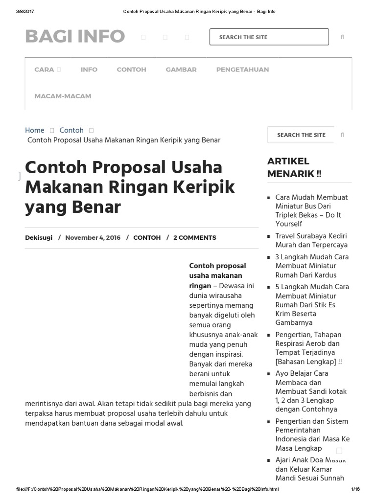 Contoh Proposal Usaha Makanan Ringan Keripik yang Benar ... Contoh proposal usaha makanan ringan - Dewasa ini dunia wirausaha sepertinya memang banyak digeluti oleh semua orang khususnya anak-anak muda yang penuh dengan inspirasi. Banyak dari mereka berani untuk memulai langkah berbisnis dan merintisnya dari awal. Akan tetapi tidak sedikit pula bagi mereka yang terpaksa harus membuat proposal usaha terlebih dahulu untuk mendapatkan bantuan dana ...